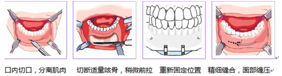 术前要先做全身麻醉,手术时间约个半小时,伤口在嘴巴内及下牙龈处。手术方法是依照求美者的比例,将下巴骨锯开,重新固定在较好的位置;手术当天就可以回家,不用住院。